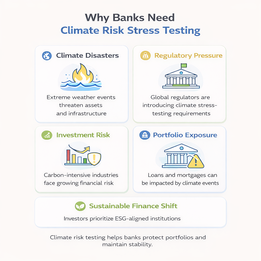 Financial institutions operate in an increasingly volatile global environment where climate-related disruptions can significantly impact assets, investments, and credit portfolios. Key reasons banks need climate stress testing include: