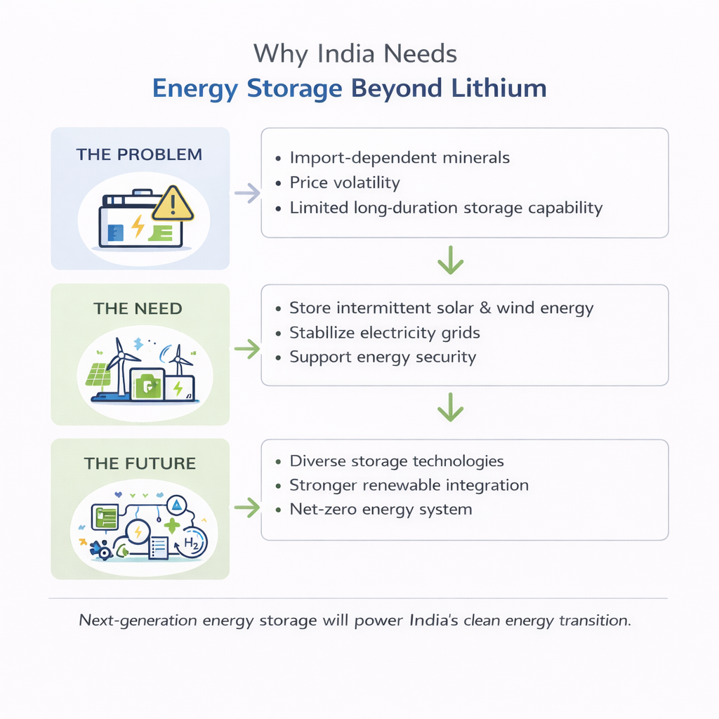 First, we should understand why we need an alternative to the most common energy storage technology on the market. Lithium-ion batteries have catalyzed the first phase of India's clean energy transition, especially in electric vehicles and utility-scale battery storage. But scaling them further involves some challenges. Also, one will face supply chain vulnerabilities because lithium and cobalt are import-intensive. Moreover, the prices of these materials fluctuate, making cost competitiveness difficult. Lastly, conventional lithium batteries are not well-suited for long-duration storage.