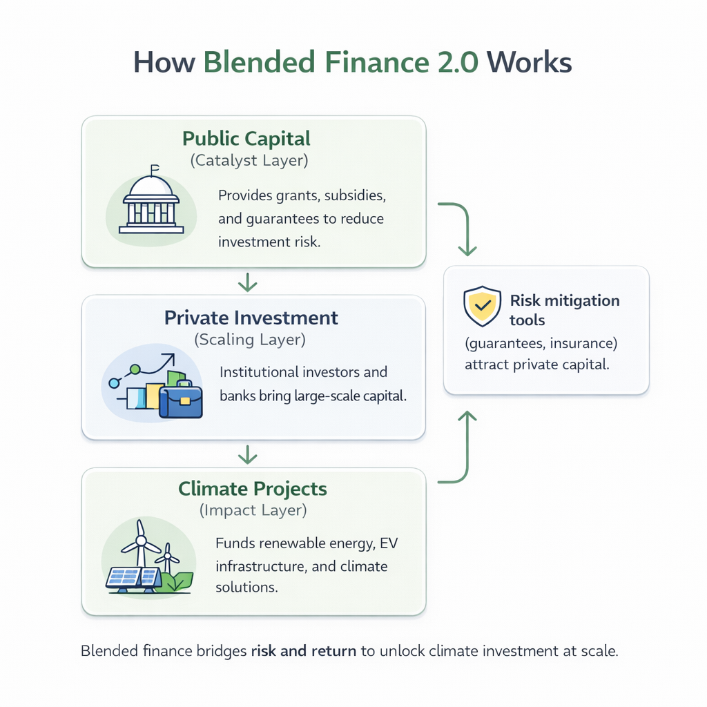Blended Finance 1.0 was often project-specific and donor-driven, limited in scale and replication. In contrast, Blended Finance 2.0 is about building enabling ecosystems. This means not just funding a solar park, but creating regulatory frameworks, risk-sharing facilities, and carbon pricing signals that enable multiple similar projects to flourish across regions.