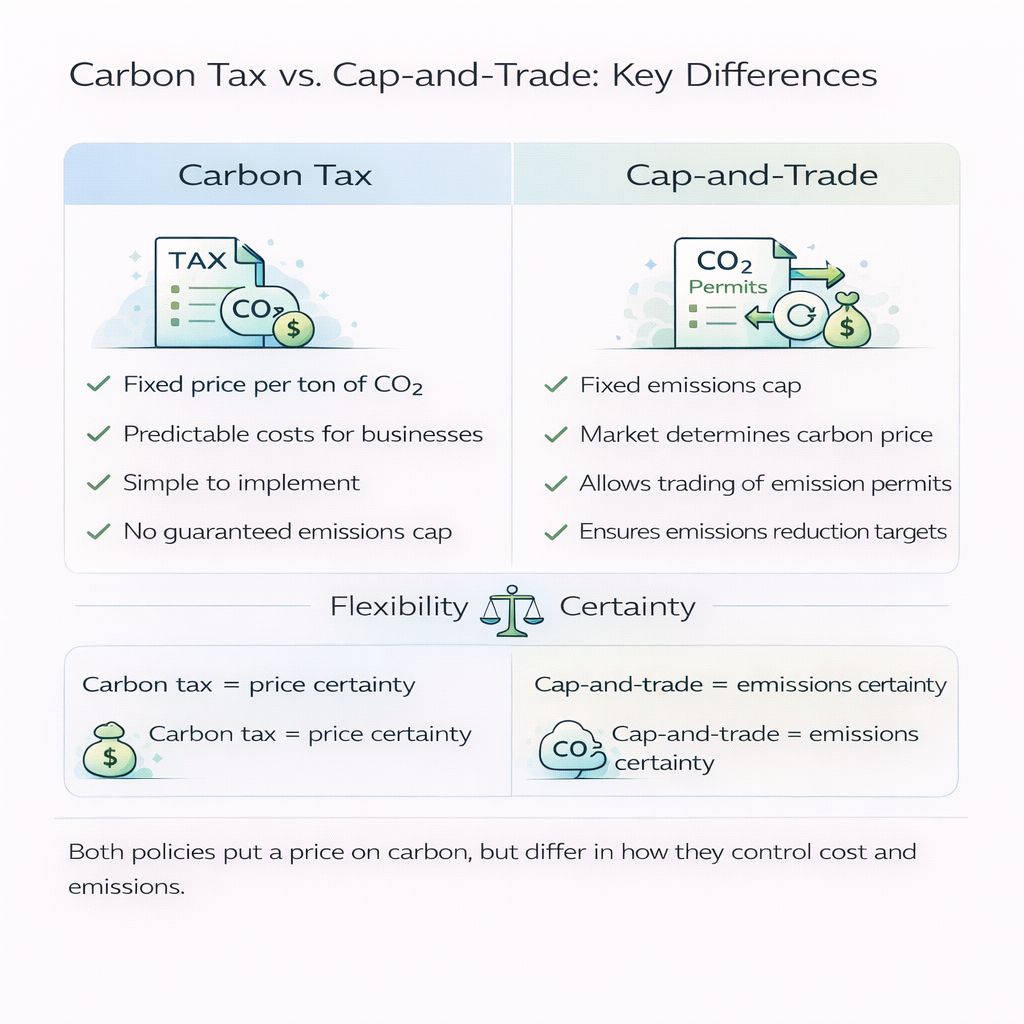 In practice, many jurisdictions use hybrid models, applying a carbon tax in some sectors (like transport or buildings) while using cap-and-trade for others (like electricity or heavy industry).