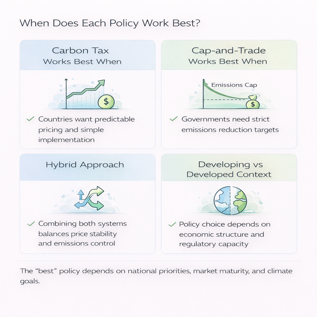 The ideal carbon pricing strategy depends on context. A country with robust monitoring systems, strong institutions, and a developed energy market may benefit from a cap-and-trade system, particularly if emissions reduction targets must be strictly enforced. Countries that seek simplicity, transparency, and predictable pricing, especially those with constrained administrative capacity, may prefer a carbon tax.