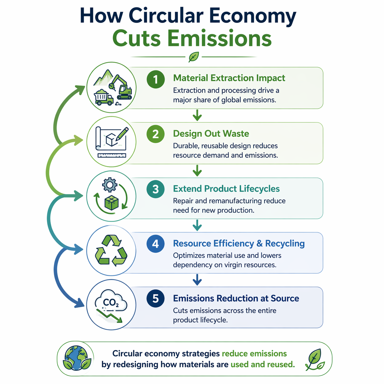 The circular economy delivers measurable emission reductions through procurement specification changes, product design for future disassembly, and financial systems that account for avoided carbon emissions. Organisations that operationalize these principles gain a competitive advantage as climate regulations tighten.