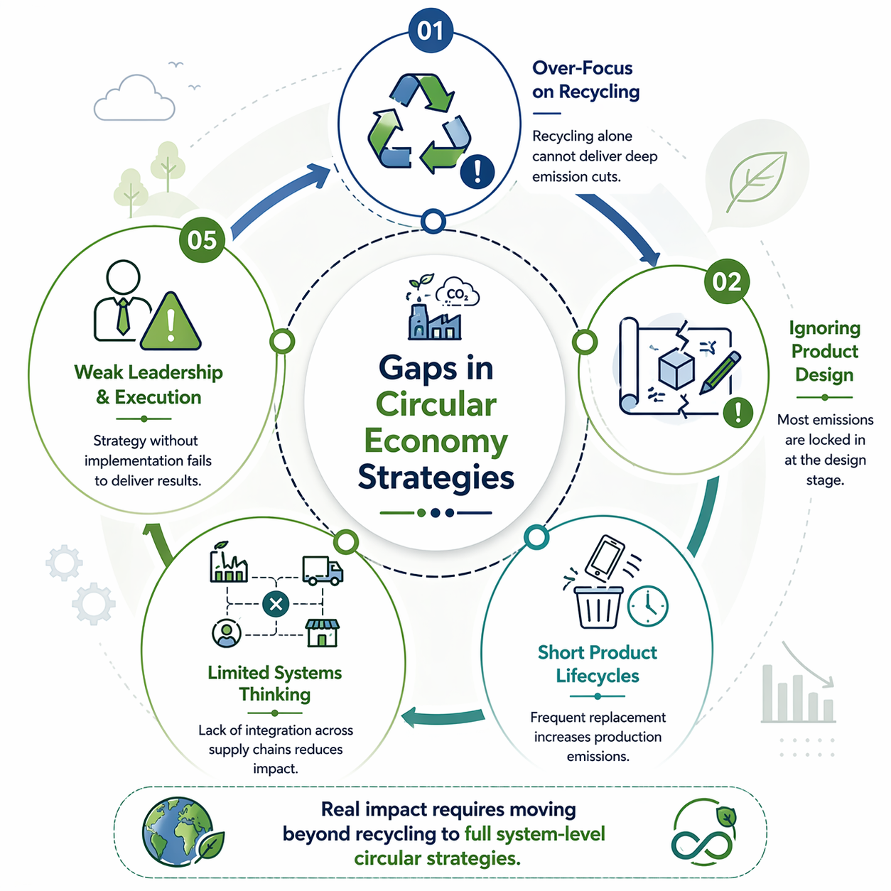 The implementation of sustainability programs fails because organisations treat circular economy practices as secondary to their primary emission reduction goals. The decarbonisation plan receives CFO approval while the CSO identifies Scope 3 emission hotspots, but procurement continues to purchase virgin materials because nobody calculated the carbon delta. Organisations face difficulties in assessing their net-zero progress when they implement circular economy principles.