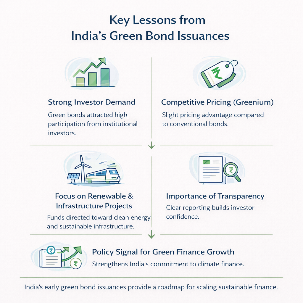 The funds were allocated to public-sector projects in renewable energy, clean transport, sustainable water and waste management, and climate adaptation. A World Bank case study highlights that India aligned its Green Bond Framework with the International Capital Market Association (ICMA) Green Bond Principles. The government also established a Green Finance Working Committee under the Ministry of Finance to ensure governance and oversight.