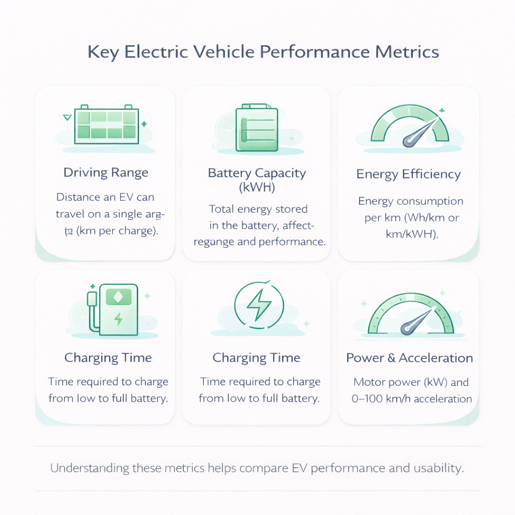 Driving range measures the total distance an EV can travel on a single charge, typically in kilometres or miles. It is one of the most critical electric vehicle performance metrics for buyers, directly affecting daily usability, trip planning, and overall confidence in making the switch from conventional vehicles.