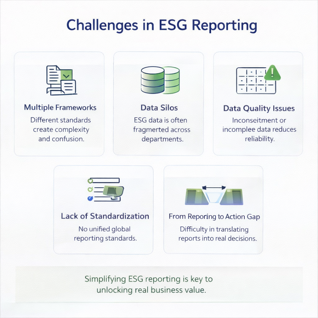 Despite its growing importance, ESG reporting is fraught with obstacles that can compromise its accuracy,consistency, and usefulness: