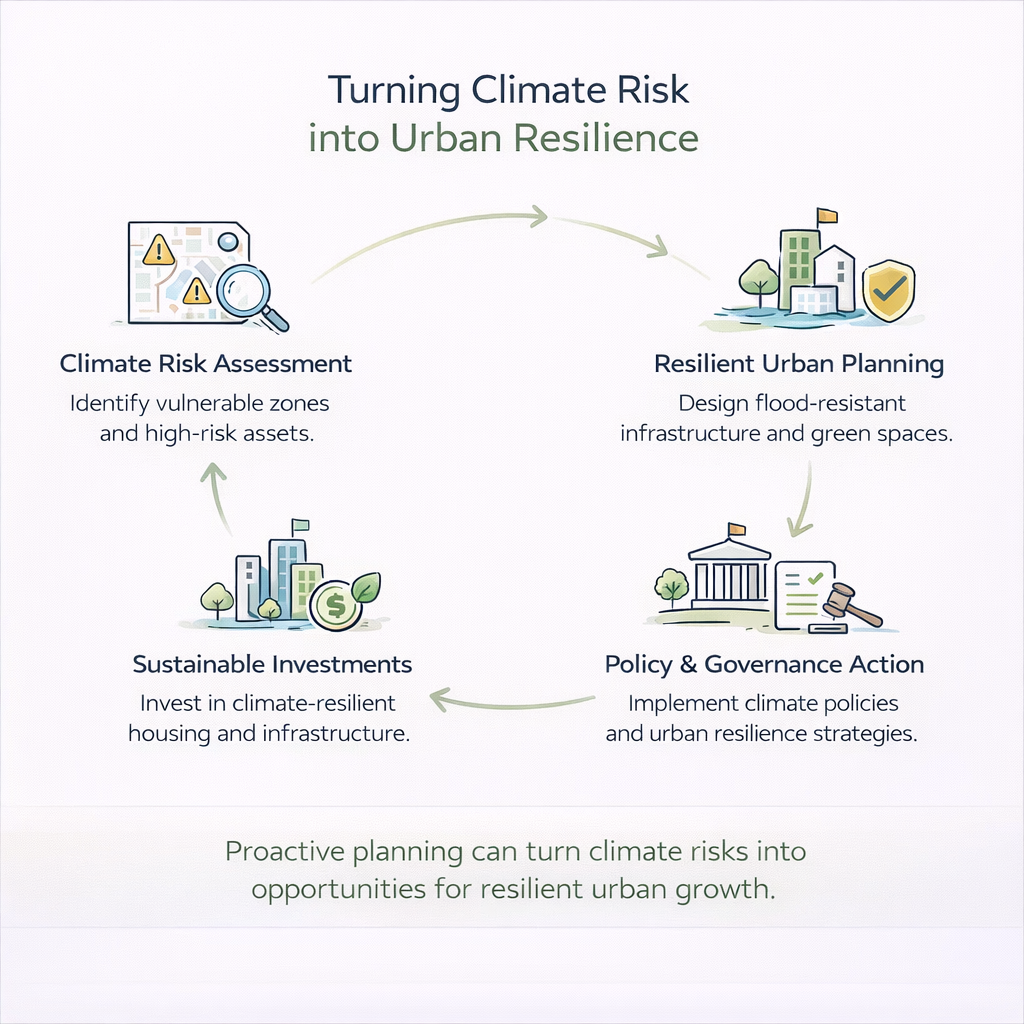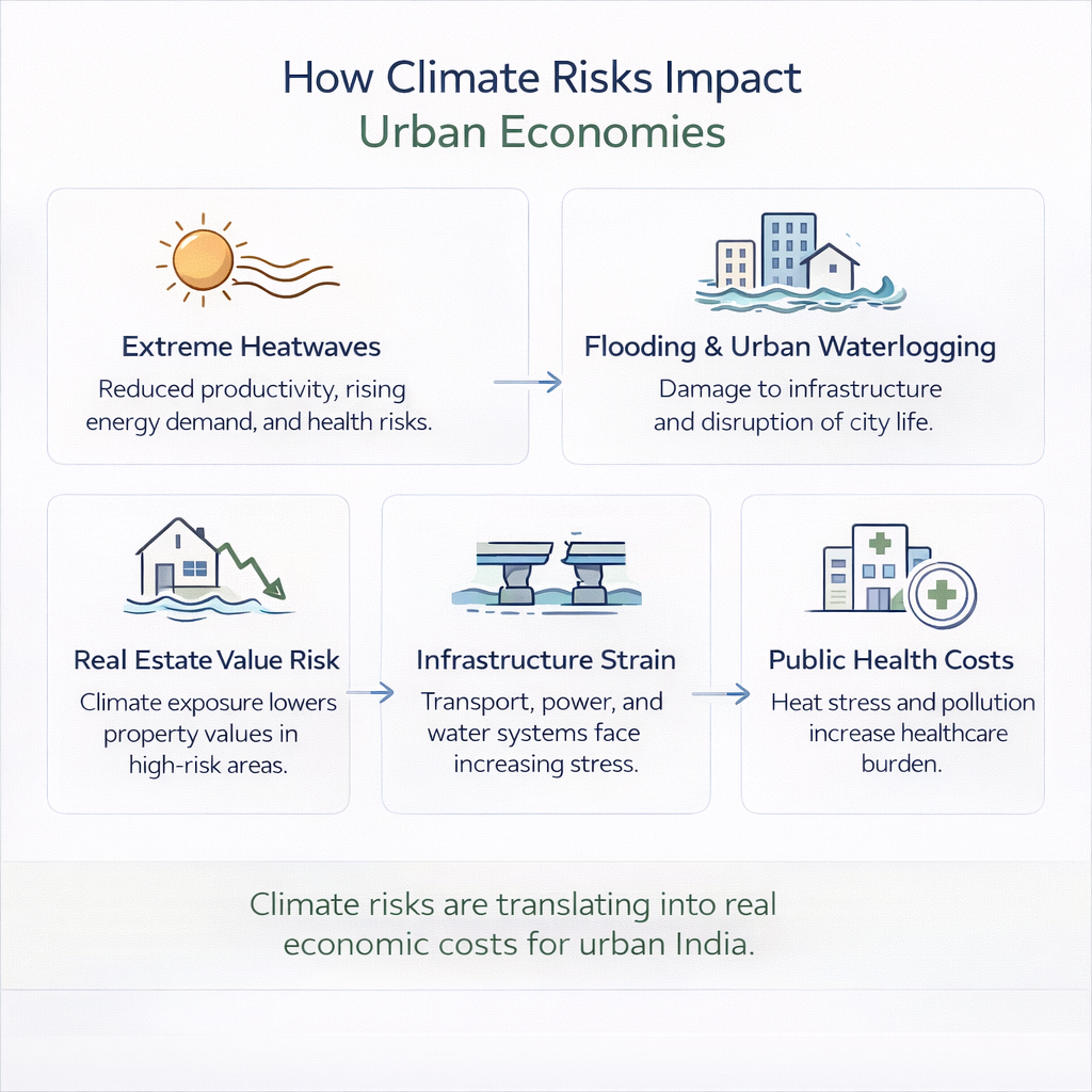 Climate risk in cities manifests not only through direct physical impacts—like floods damaging homes but also through financial and systemic disruptions. Rising temperatures drive up energy demand and cooling costs, lower worker productivity, strain water supplies, and deepen inequality. These factors are now beginning to influence real estate values, mortgage risk, insurance availability, and urban migration patterns, particularly in India’s rapidly growing Tier 1 and Tier 2 cities.