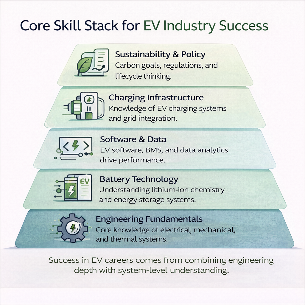 If you’re preparing learners for tomorrow’s jobs, or planning to transition into the EV domain, or redesigning educational curricula, understanding which skills the EV industry values most is the first step toward making a meaningful impact. Let’s unpack what the EV ecosystem expects from its future professionals.