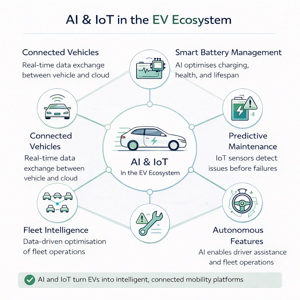 Modern EVs are evolving rapidly thanks to two revolutionary technologies: Artificial Intelligence (AI) and IoT. Together, these technologies make electric vehicles smarter, safer, and more user-friendly. EV engineers are at the heart of this transformation, developing sophisticated systems that ensure vehicles are always connected, efficient, and intuitive.
