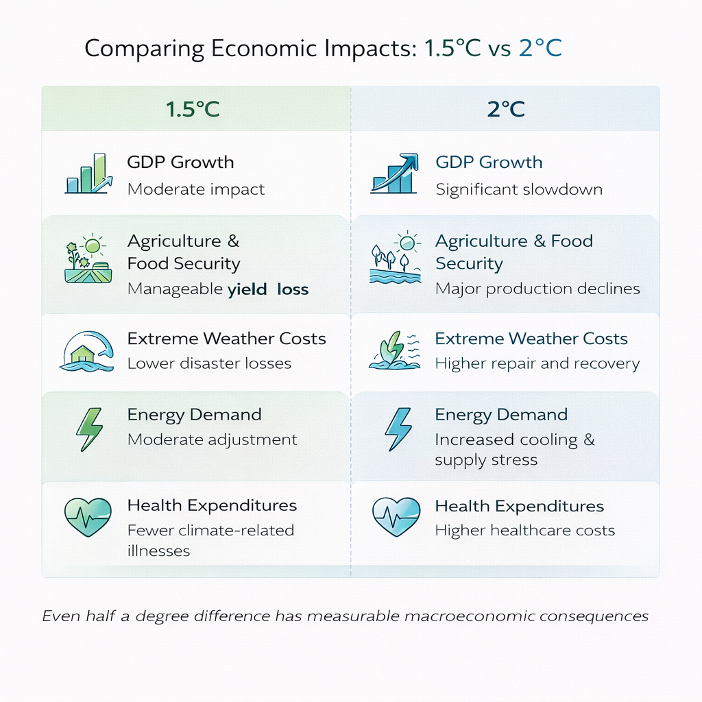 In climate negotiations, the difference between 1.5°C and 2°C of global warming might sound marginal. After all, it’s just half a degree. But in the world of climate economics, that half-degree marks the boundary between disruption and devastation. For economists, climate scientists, and policymakers, understanding this difference is not just about physical risk; it’s about forecasting the macroeconomic trajectory of nations, industries, and livelihoods.