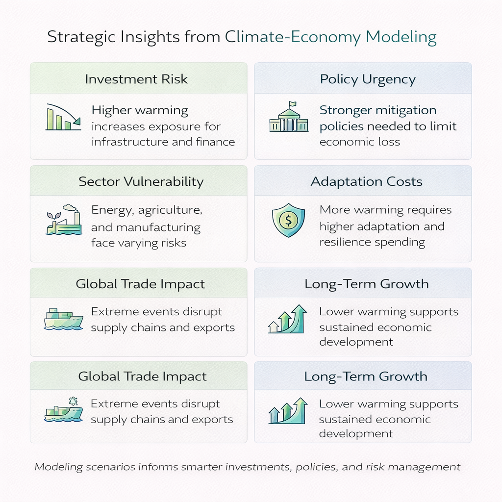 These models simulate how rising temperatures impact agriculture, infrastructure, labor productivity, health outcomes, migration, and disaster recovery. They then translate those impacts into changes in GDP, employment, inflation, and long-term growth.