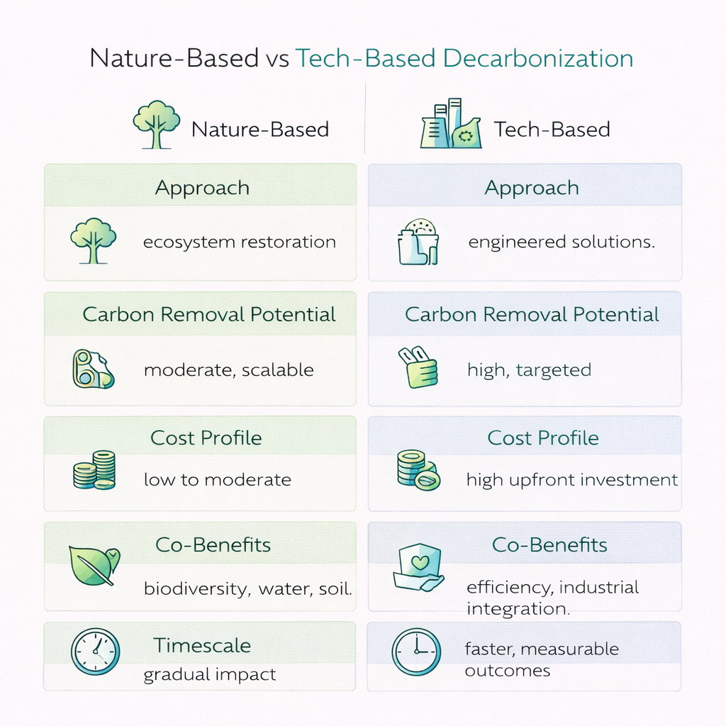 Before going into more detail, it is important to explain why the debate exists at all. The climate challenge is complex, and so is the path to climate change. That’s why both nature-based and advanced carbon capture technologies continue to receive a lot of attention.