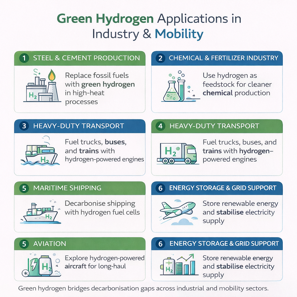 In steelmaking, Sweden's HYBRIT is replacing coal and dramatically reducing emissions with hydrogen. In the chemical sector, the green ammonia production project at NEOM illustrates how other large industries are shifting to renewable hydrogen and its derivatives.