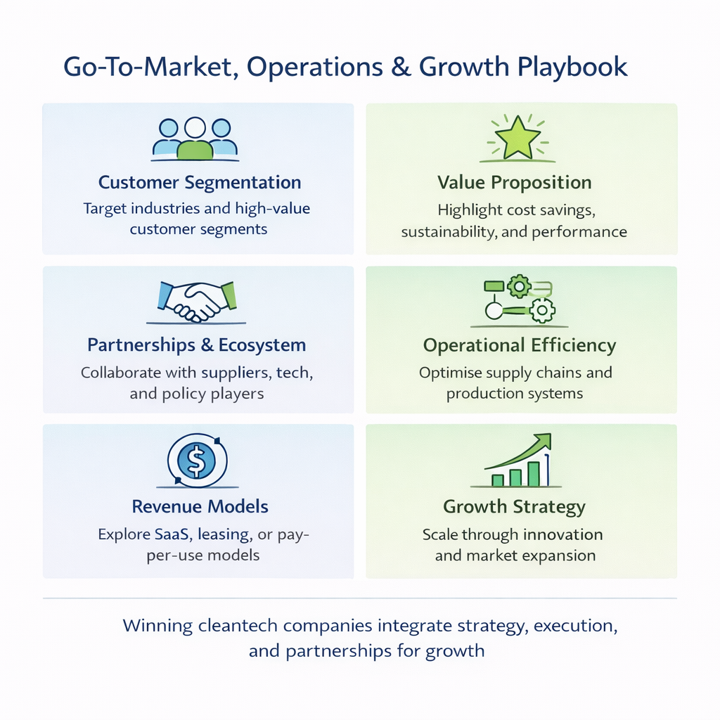 A high-performing Cleantech GTM and growth plan follows a sequence of tightly connected strategic actions. It begins by articulating a clear value proposition rooted in customer economics, followed by pilot projects that help validate the solution and pave the way for procurement. Once traction is visible, the organisation must codify its operational processes, including installation, service workflows, and performance monitoring.