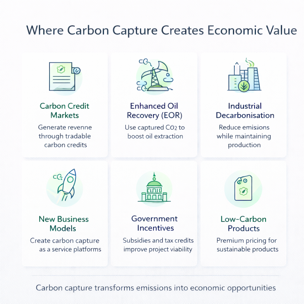 Carbon capture becomes economically viable when industries can monetize stored CO₂ through carbon credits. Companies capturing and permanently storing CO₂ can sell credits to polluting firms looking to offset their emissions.