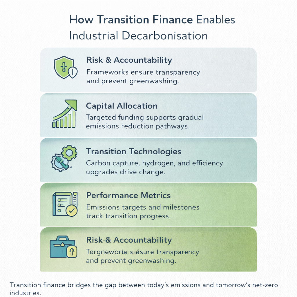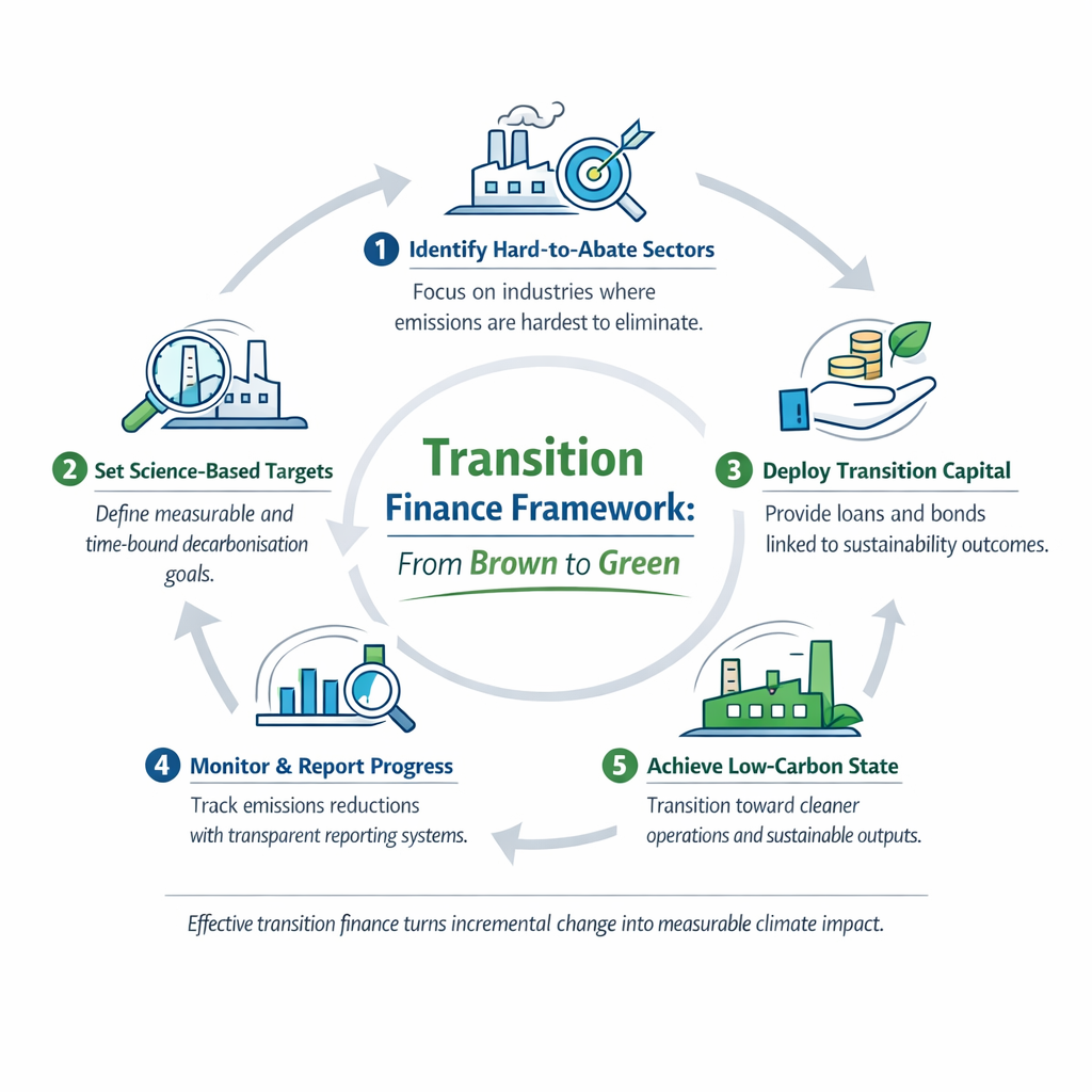 Transition finance refers to financial flows directed at decarbonising essential but emission-intensive sectors. Unlike green finance, which funds activities that are already sustainable, transition finance supports industries that are actively transforming their processes to align with long-term climate goals.